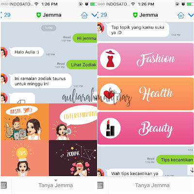 Kalau Jemma, dia ini chatbot Line yang dibuat sama WomanTalk. Buat ngobrol sama Jemma, bisa add @jemma di Line. Nanti di awal dia nanya nama kamu. Nah, fitur yang ada di Jemma itu :